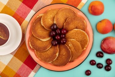 Подача: Подавайте панкейки с ягодами, медом, йогуртом или орехами по вашему вкусу.