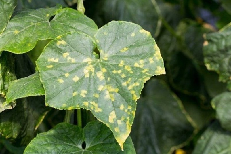 Жёлтые или светло-зеленые пятна на верхней стороне листьев, ограниченные жилками.