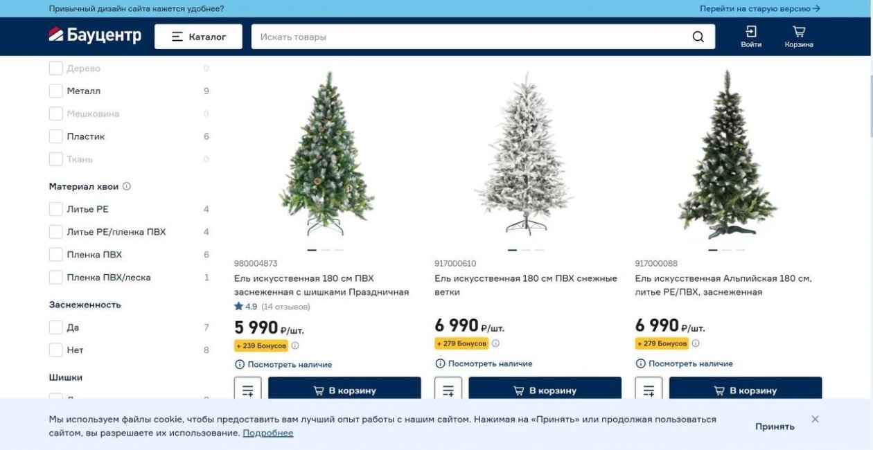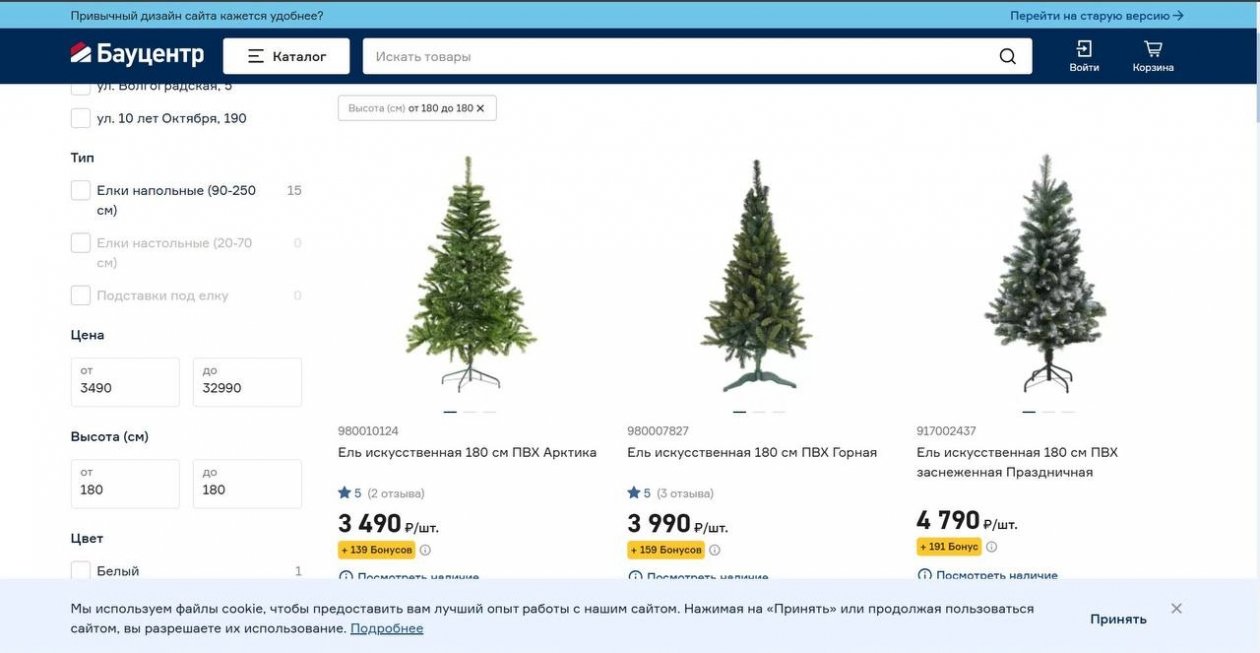 В "Бауцентре" минимальная цена — 3490 рублей за модель "Арктика". Она выполнена из ПВХ, с мягкими плёнчатыми иголками и двухцветной хвоей для объёма. Покупатели отмечают хорошую пышность и удобную сборку.