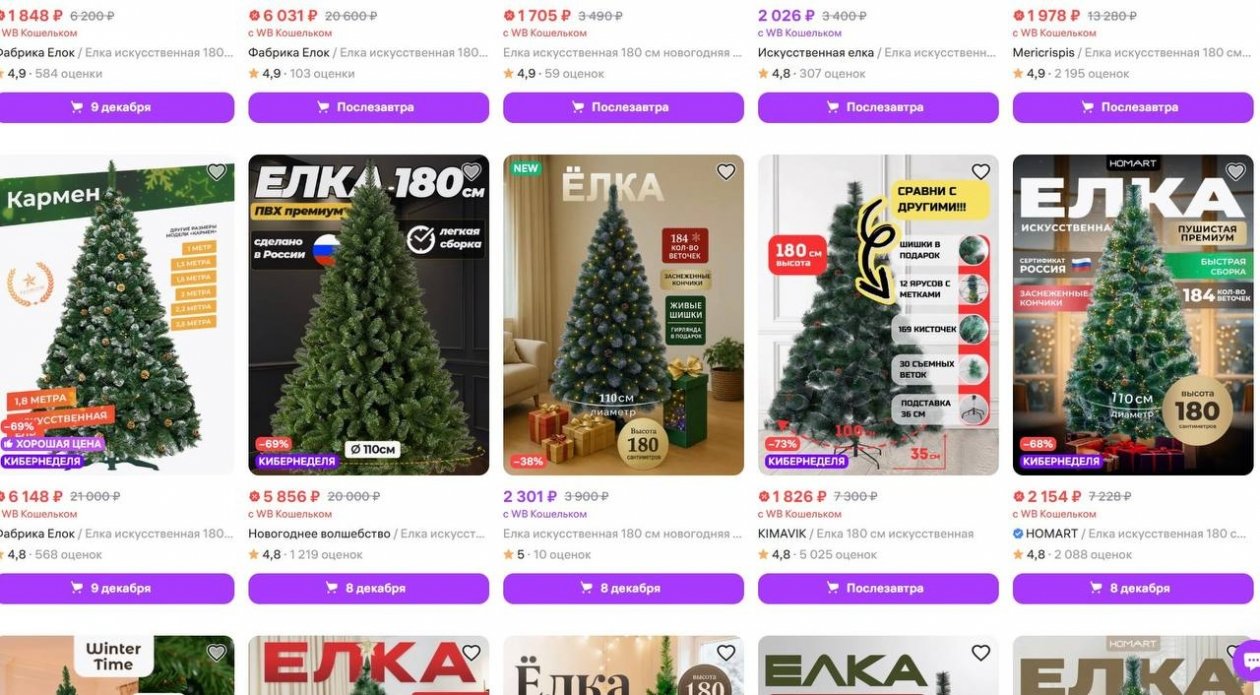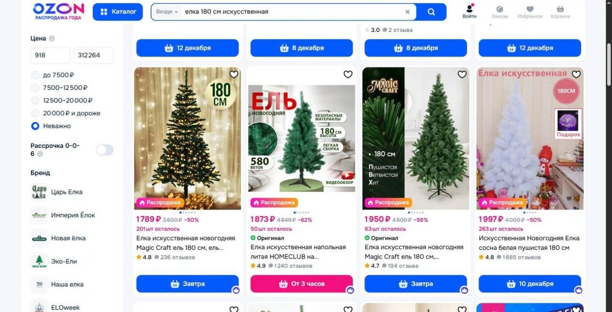 На Ozon (18+) можно найти ель высотой 180 см всего за 1514 рублей, правда, без указания материала, страны производства и каких-либо отзывов — чистая лотерея. Чуть дороже, за 1789 рублей, продаётся китайская ёлка из ПВХ с гарантией, но с минимальной пышностью.