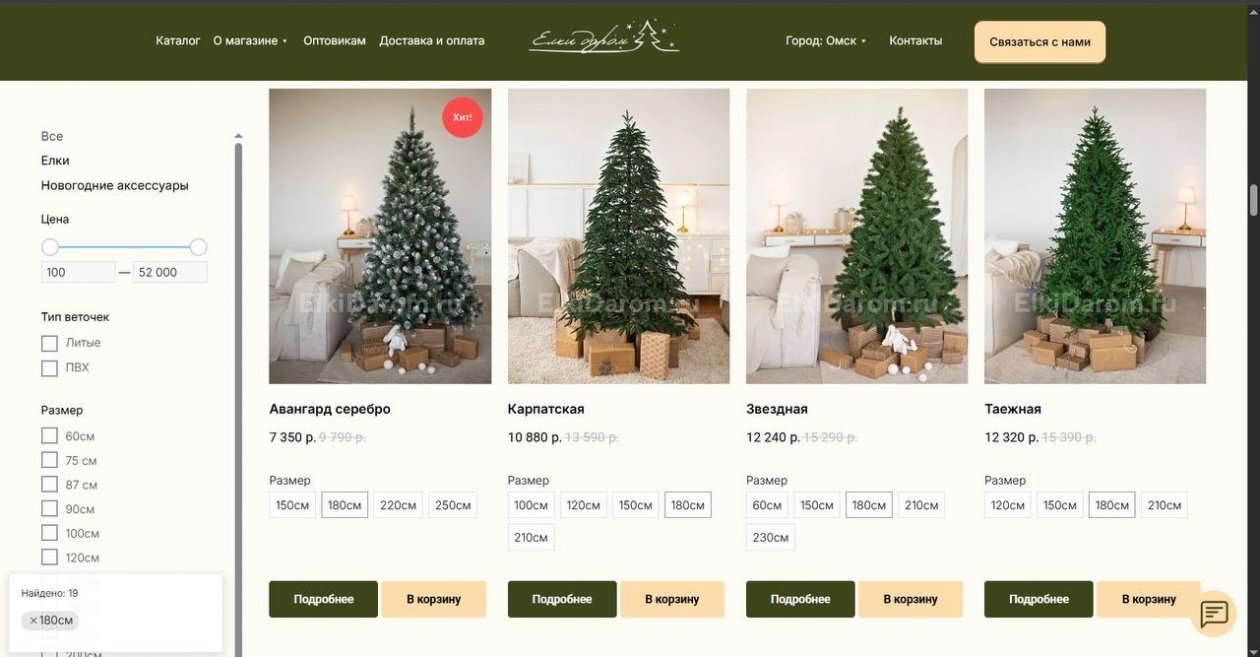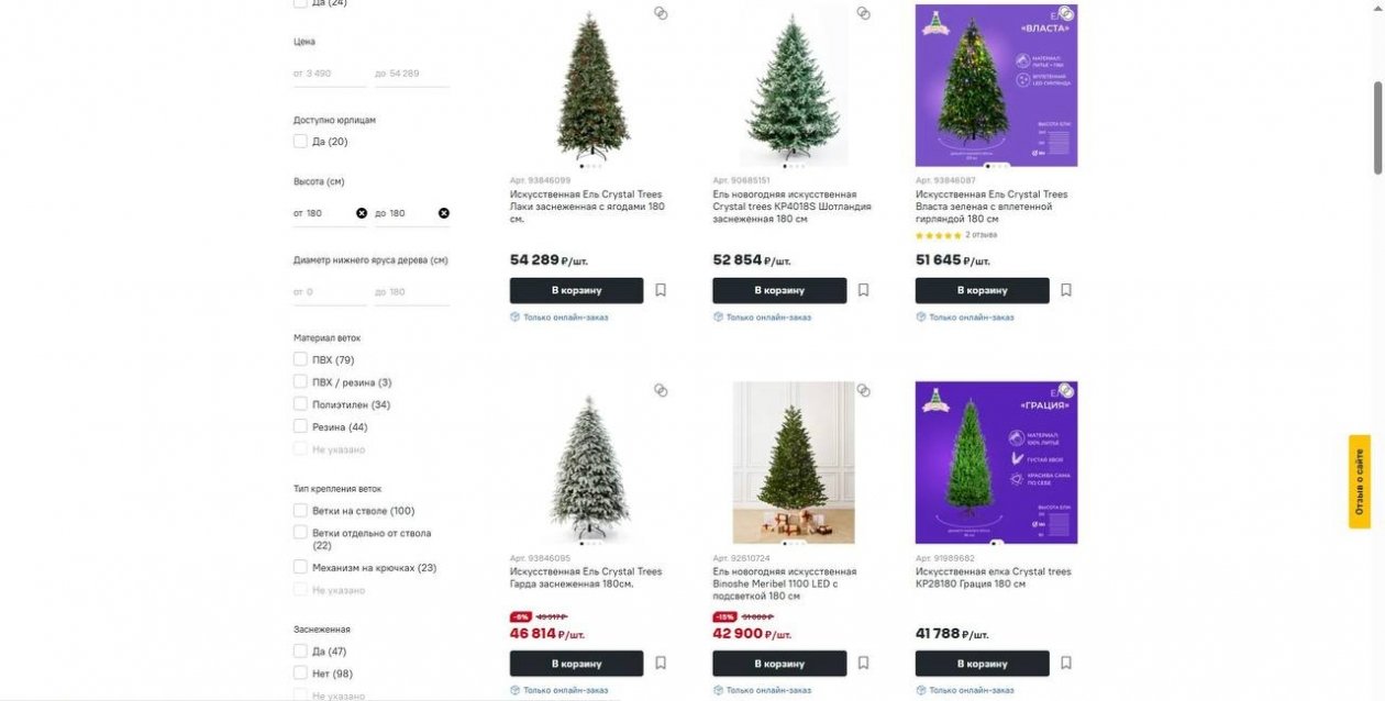 Самой дорогой позицией среди ёлок 180 см здесь считается "Императорская" ёлка за 16 400 рублей. Она полностью литая, плотная и выглядит максимально натурально.