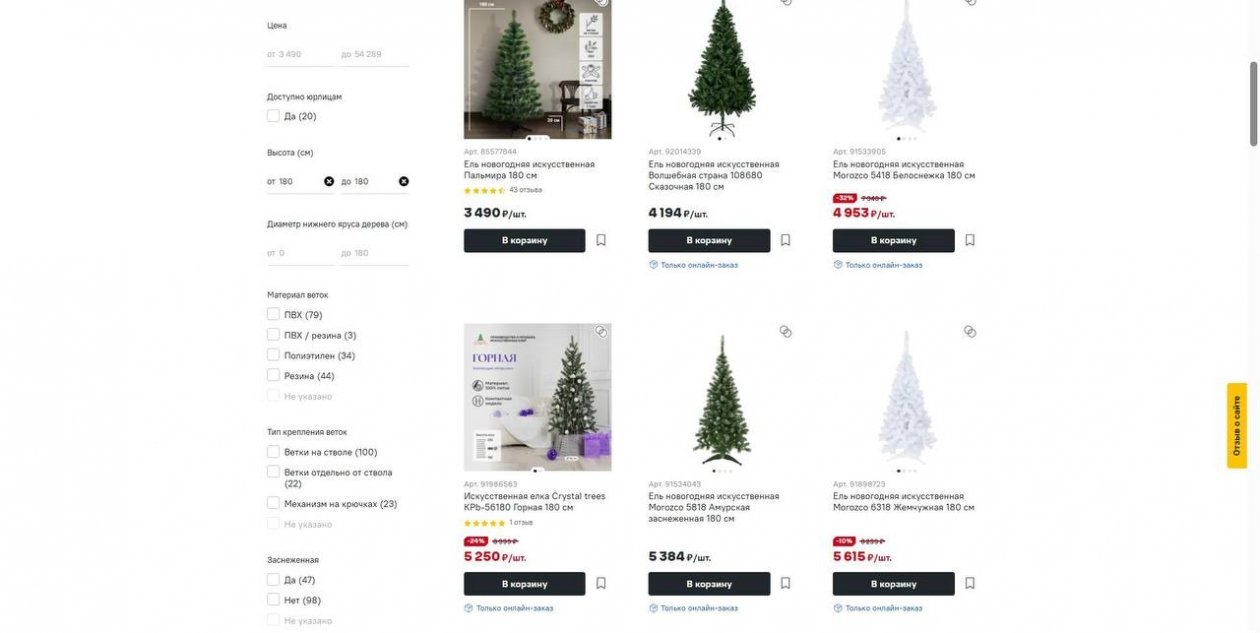 В премиум-сегменте магазин предлагает модели за 40–50 тысяч: заснеженные, с гирляндами, ягодами и литой резиновой хвоей. Отзывов на них пока нет, но внешне выглядят эффектно.