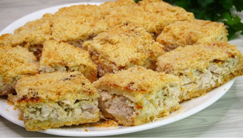 5. Начинка в форму. Выложите подготовленную куриную массу. Посыпьте сверху оставшимся тестом.
