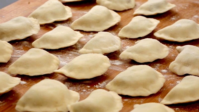 — Выложите начинку в центр, защипните края — получатся полумесяцы или "ушки".