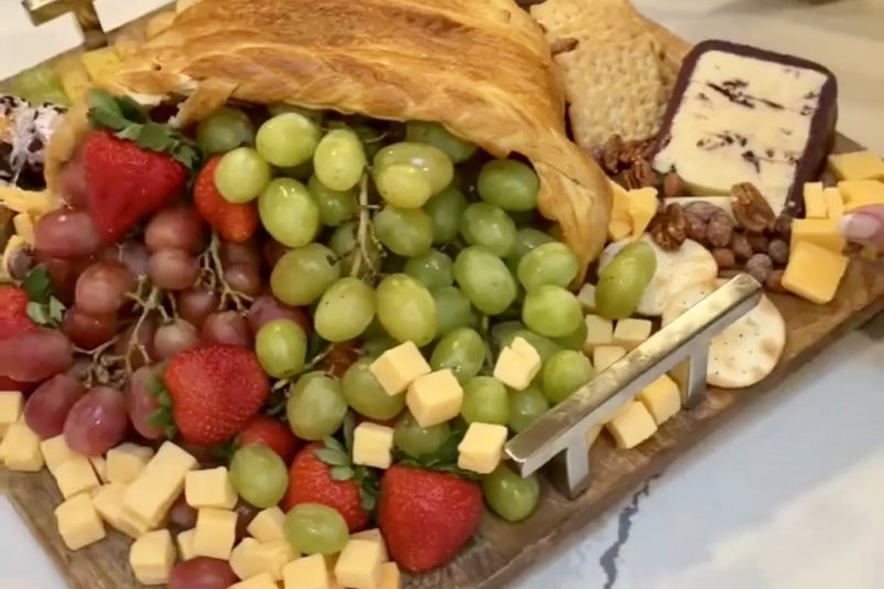 — Остывший "рог" наполните виноградом, а вокруг разложите сыры, оливки, орехи, сухофрукты.