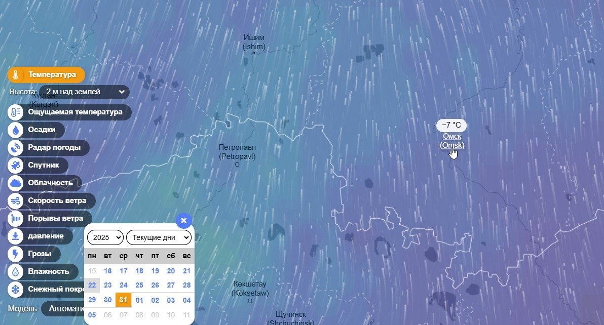 Ранее в ряде региональных СМИ и пабликов появлялись сообщения о якобы надвигающихся аномальных морозах до –30…–40 градусов, со ссылкой на визуализации портала Ventusky. Однако специалисты напоминают, что прогнозы на погодных сервисе меняются практически ежечасно и зависят от выбранной модели и временного горизонта. Например, сейчас, по состоянию на утро 22 декабря, согласно скриншотам Ventusky, 31 декабря и 1 января в Омске ожидается температура в диапазоне –11…–13 градусов, без экстремального холода.