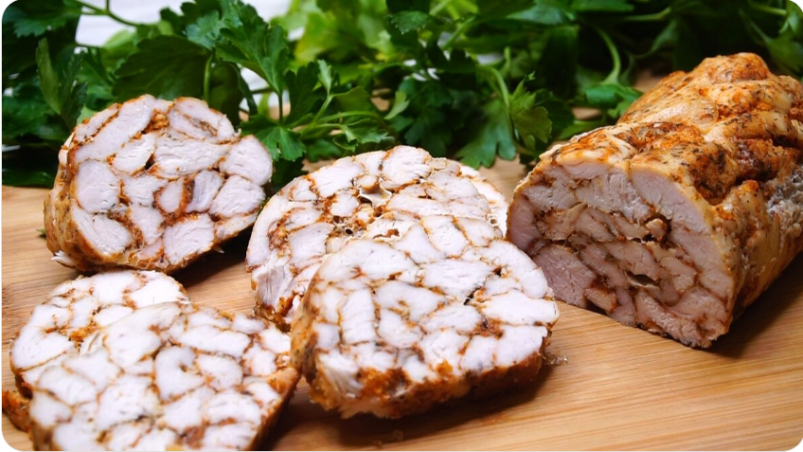 Рулет получается плотным, сочным, с красивой "мраморной" структурой. Его удобно нарезать тонкими ломтиками и подавать как холодную закуску или использовать для бутербродов.
