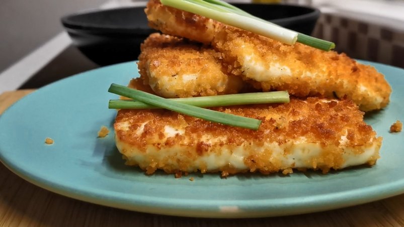 Сыр жарят примерно по 3 минуты с каждой стороны до золотистой корочки. Это не фритюр, но обжарка должна быть достаточно активной.