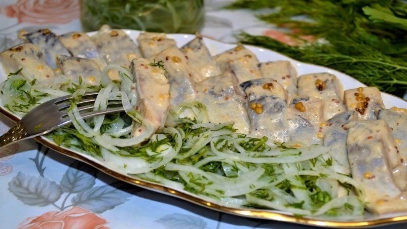 Закуску подают с маринованным луком, отварной картошкой или свежим хлебом. Пикантный вкус селёдки в горчичном маринаде делает её идеальным украшением праздничного стола — она всегда улетает первой.