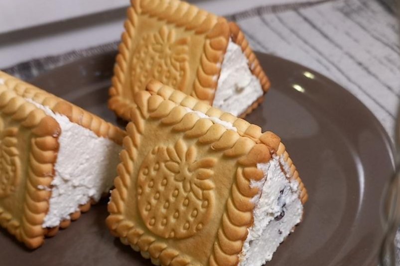 • Закройте "домик" с двух сторон с помощью второго печенья. Распределите творожную массу ложкой, чтобы заполнить все пустоты и укрепить конструкцию.