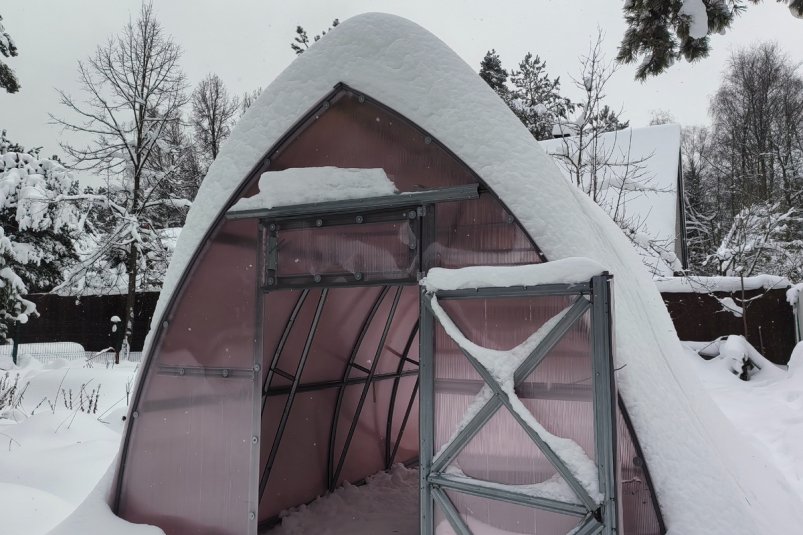 Принято считать, что каплевидные и коньковые теплицы лучше справляются со снеговой нагрузкой. Раньше так и было: снег накапливался — и в какой-то момент съезжал сам.