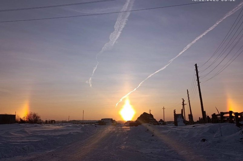 OmskMedia, 16 февраля. Жительница села Саргатское Милена Пономарёва запечатлела редкое атмосферное явление на рассвете 16 февраля. Фотографии необычного эффекта она опубликовала в своём телеграм-канале (18+), где регулярно делится снимками природных красот региона.