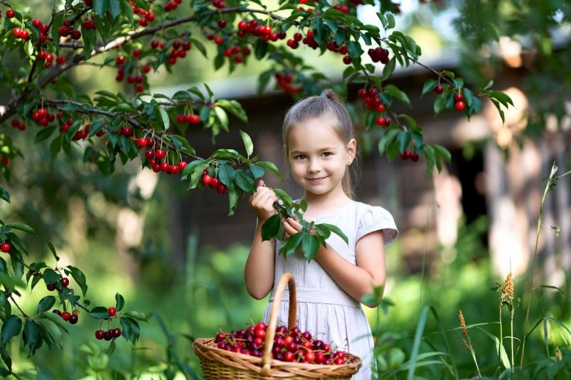 Первая в списке — вишня Жуковская отечественной селекции. Дерево вырастает не выше 3,5 метра с густой, но умеренно загущённой кроной. Сорт неприхотлив: нормально переносит почти любые погодные условия, за исключением затяжных дождей. Ягоды крупные (4–6 г) с классическим кисловатым вишнёвым вкусом.
