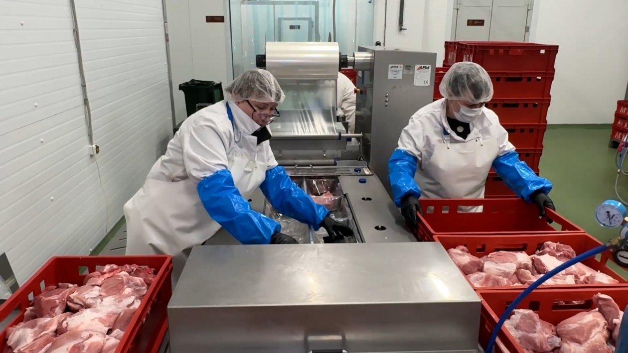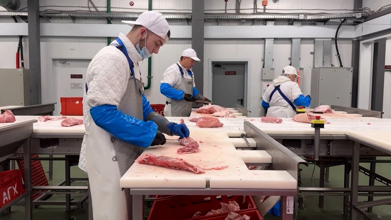 В агропарке также работает мясной цех полного цикла, запущенный в июле 2025 года. Его производительность — до 20 тонн в смену (440 тонн в месяц при полной загрузке). Ассортимент насчитывает более 70 наименований: от крупнокусковых полуфабрикатов до копчено-вареных деликатесов. В планах — выпуск пельменей. Предприятие обеспечивает 62% регионального производства полуфабрикатов и 20% деликатесов. Здесь трудятся 59 человек.