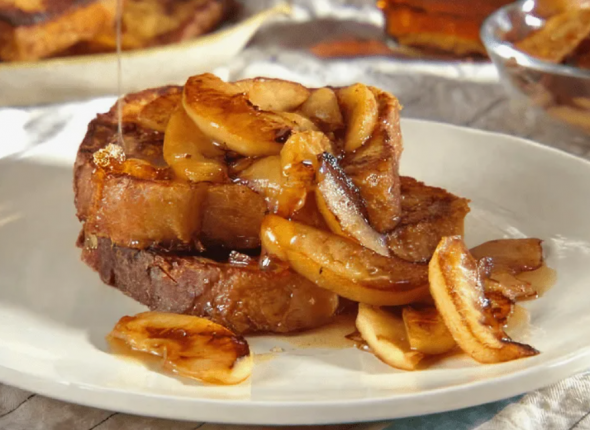 Гренки на тарелку, сверху — яблоки с карамелью, и немного сахарной пудры через сито для красоты. Перфект! :3