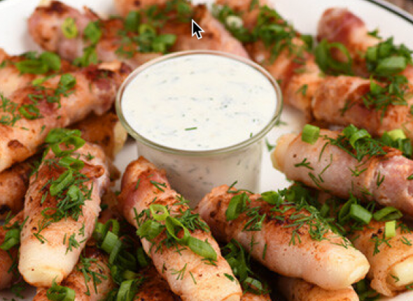 Нарежьте сыр брусочками, заверните в бекон и обжарьте на сухой сковороде или запеките. Сыр остаётся мягким внутри, не вытекает, а бекон придаёт пикантную копчёную ноту. Подавайте с зеленью или лёгким соусом.