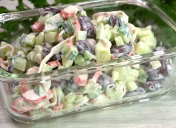 Основа салата — три доступных ингредиента: крабовые палочки, свежий огурец и консервированная красная фасоль. Дополняют их чеснок и домашний майонез, который придаёт блюду нежность и пикантность. Всё вместе создаёт лёгкий, сочный и удивительно сбалансированный вкус. Рецепт от канала "Готовим с Калниной Натальей" на платформе Дзен (12+).