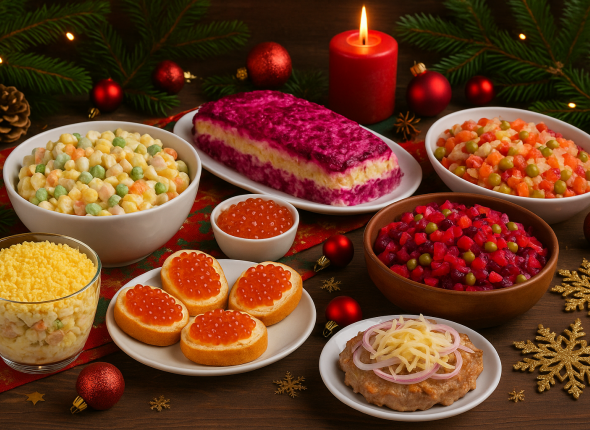 OmskMedia, 28 декабря. Оливье, селёдка под шубой, мясо по-французски и бутерброды с икрой — именно эти блюда десятилетиями создавали тот самый вкус Нового года. Пора поглядеть рецепты их, чтобы снова приготовить и подать на стол. ИА OmskMedia собрало подборку настоящей советской классики, без которой праздник в СССР был просто немыслим.
