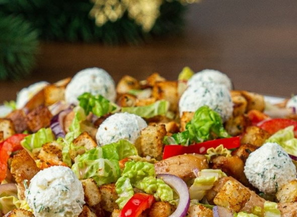Салат "Новогодний" получается красивым, сочным и пикантным. Мясо придает сытность, овощи — легкость, а сухарики и сырные шарики добавляют неповторимый вкус. Он отлично подойдет для праздничного стола и порадует всех гостей своим необычным сочетанием ингредиентов.