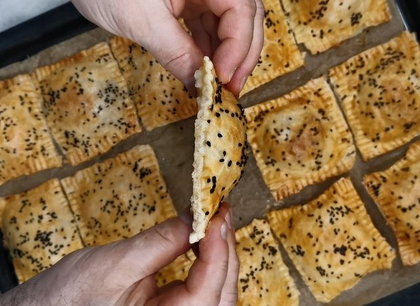 Идея проста: использовать готовое слоёное тесто и фарш. Для начинки лучше всего подойдёт куриный или любой другой фарш по вкусу. Главная составляющая вкуса — репчатый лук, которого берут примерно в два раза больше, чем мяса, и специя зира, придающая восточный характер. Рецепт от канала"Розовый баклажан" на платформе Дзен (12+).
