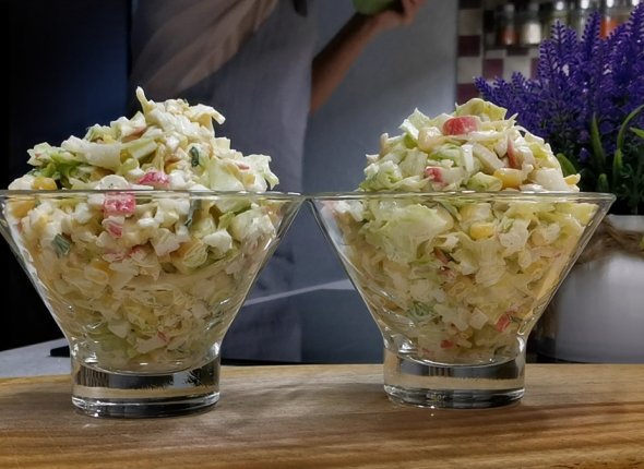 Салат получается нежным, сочным и сбалансированным по вкусу. Необычное сочетание капусты, крабовых палочек и кукурузы делает блюдо лёгким и одновременно насыщенным. Подходит для праздничного стола и повседневного меню.
