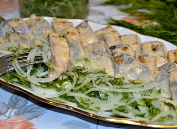 Закуску подают с маринованным луком, отварной картошкой или свежим хлебом. Пикантный вкус селёдки в горчичном маринаде делает её идеальным украшением праздничного стола — она всегда улетает первой.