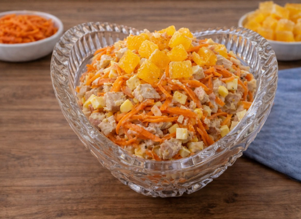 Копчёная курица придаёт салату насыщенность, морковь по-корейски добавляет пикантную нотку, сыр и яйца делают текстуру мягкой и сытной, а апельсин вносит свежесть и лёгкую цитрусовую кислинку. Несмотря на необычное сочетание, вкус получается гармоничным и цельным.