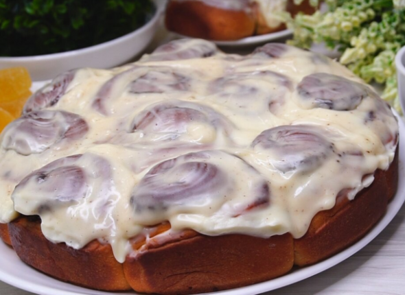 Готовый горячий пирог смажьте кремом и оставьте до остывания.