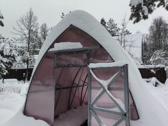 Принято считать, что каплевидные и коньковые теплицы лучше справляются со снеговой нагрузкой. Раньше так и было: снег накапливался — и в какой-то момент съезжал сам.