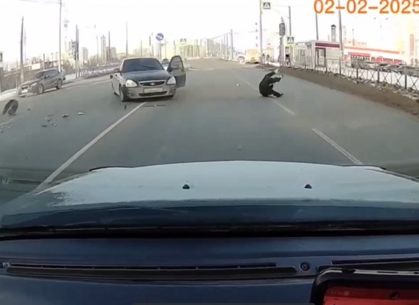 Судя по кадрам видеозаписи, после удара легковушку развернуло, дверь автомобиля распахнулась, и водитель на ходу вылетел на обочину. Несмотря на визуальную серьёзность происшествия, в полиции уточнили, что медицинская помощь участникам аварии не потребовалась, пострадавших нет.