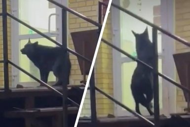 Собака села у входа и начала активно лаять на любые попытки выйти наружу
